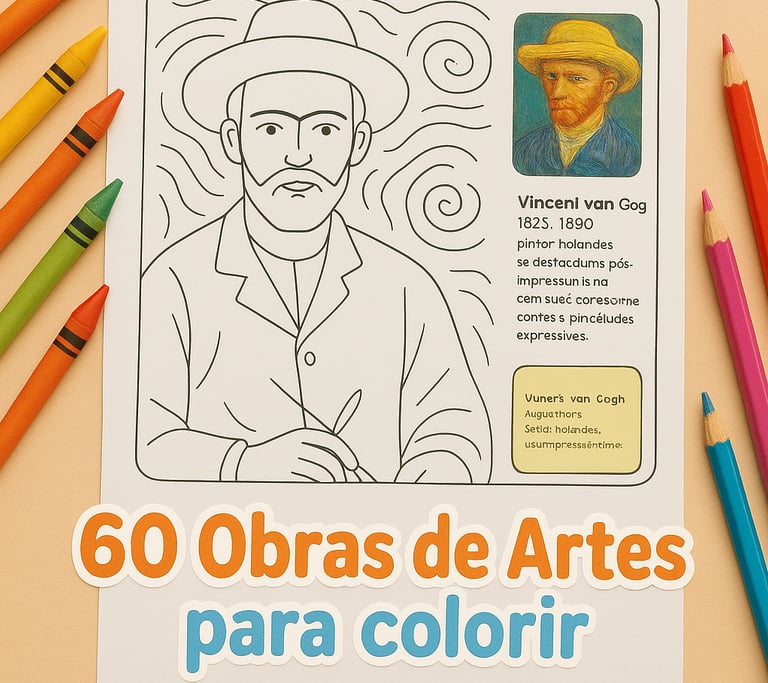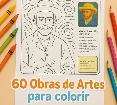 Com 60 obras de arte famosas em versão infantil para colorir e aprender, este material é perfeito para usar em casa, sala de aula ou em projetos pedagógicos - unindo história, cultura e diversão de um jeito didático e inspirador!